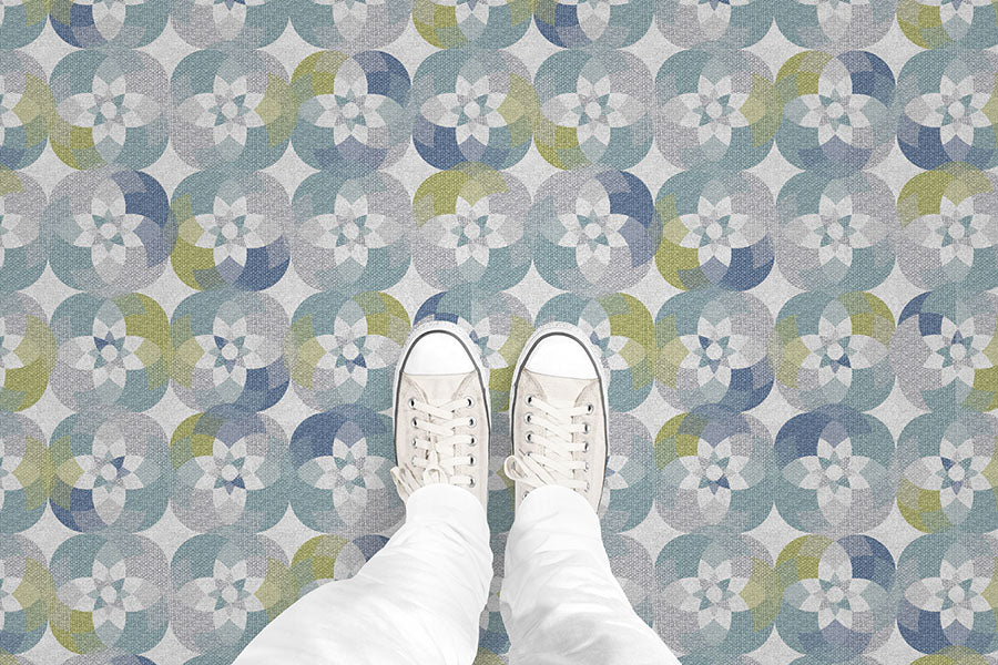 Rosette is a colorful design inspired by wooden block prints. The starburst motif brings a touch of whimsy to any residential or hospitality interior. The mix of texture and color adds dimension and works great on flooring or wall covering.