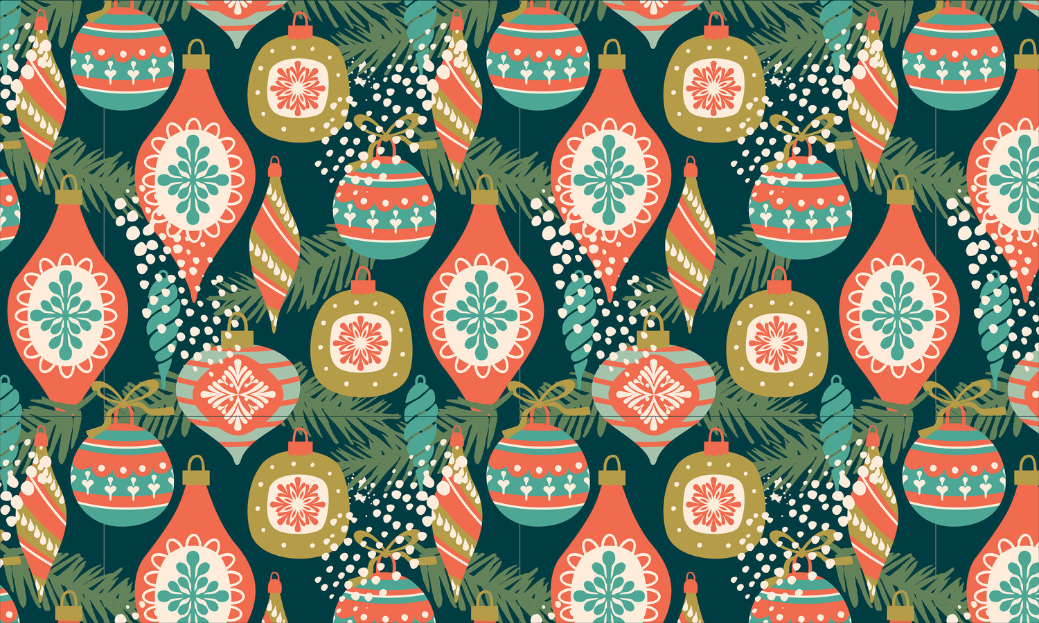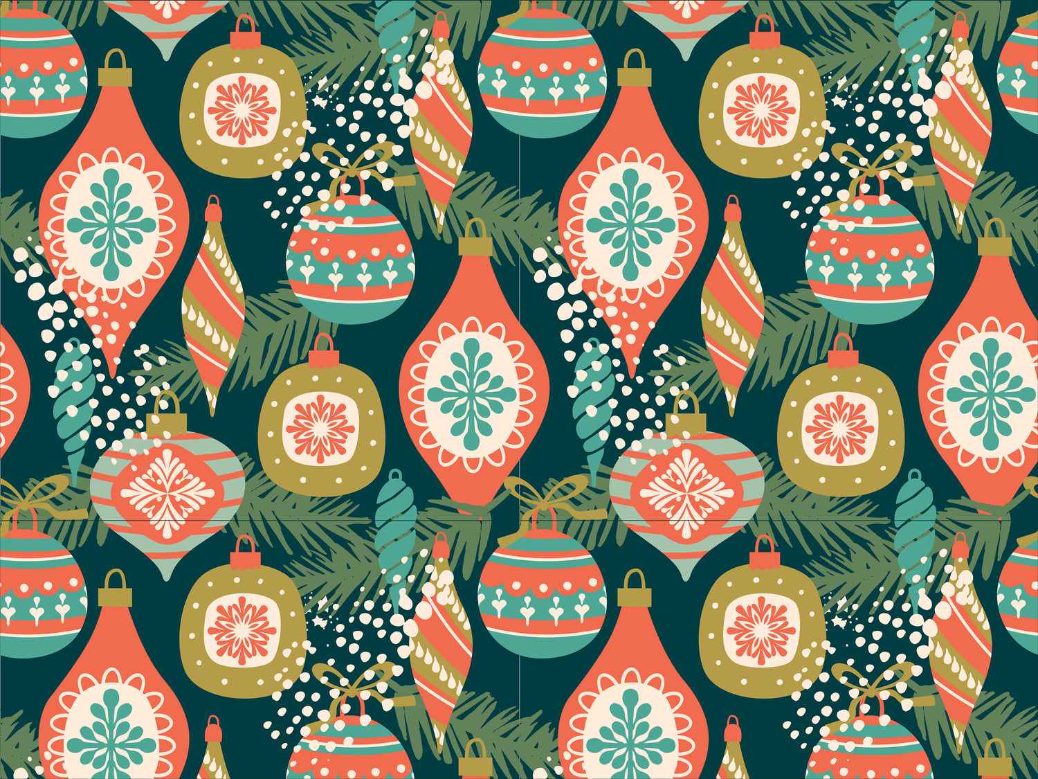 Bring the twinkle of the season into your home with our Ornaments Berber Impressions Mat. This joyful design features beautifully illustrated Christmas ornaments in warm coral, gold, teal, and mint—layered over soft evergreen branches for a classic holiday look with a contemporary twist. Each ornament includes detailed patterns that add charm and sophistication to your seasonal décor.