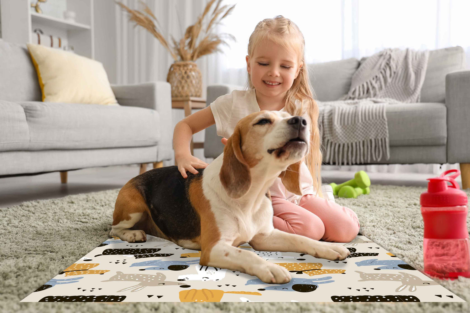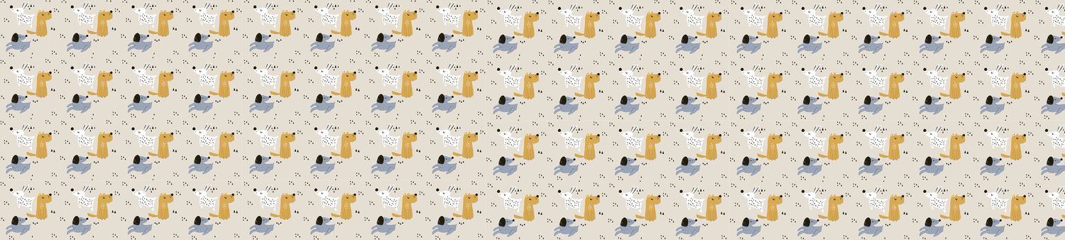 Celebrate your love for pups with our Playful Dogs Multi vinyl floor mat, featuring an adorable pattern of happy, cartoon-style dogs in shades of gold, white, black, grey, and blue on a soft beige background. Perfect for pet lovers, kids’ spaces, or playful home décor, this mat adds personality while protecting your floors.