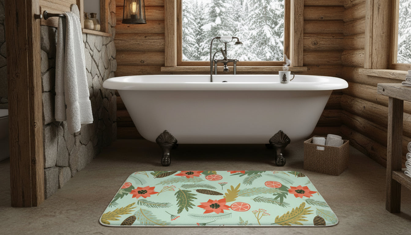 Bring the beauty of winter foliage indoors with our Holiday Pines Memory Foam Bath Mat. Featuring vibrant poinsettias, pine branches, cones, citrus slices, and delicate winter botanicals on a refreshing mint background! This mat adds a bright and festive touch to any bathroom with a perfect blend of holiday charm and modern design.