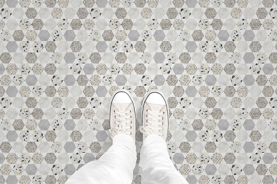 Honeycomb Terrazzo is a beautiful pattern that has the look and feel of real tile. Hexagons of different textures come together in a honeycomb tile pattern. This pattern is incredibly versatile. Scale it large for feature patterns or small for coordinates. Use in any residential or commercial interior on floors, walls, or countertops.