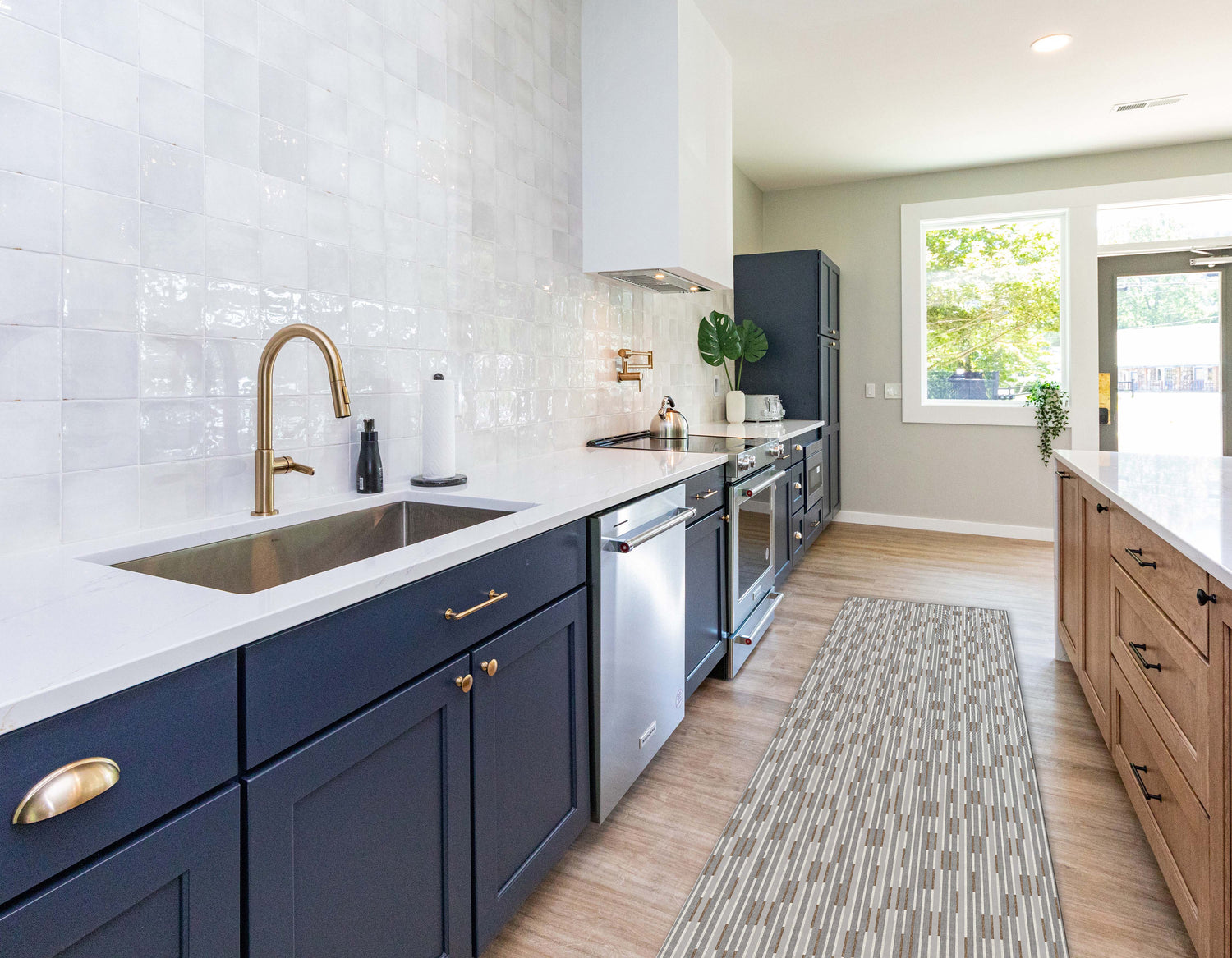 Bring modern style and functionality into your home with this neutral striped vinyl mat. Featuring a sleek pattern of gray, beige, and soft taupe tones, this mat offers a clean and contemporary look that blends effortlessly with any décor. Crafted from durable, waterproof vinyl, it’s designed to handle everyday wear in busy spaces like kitchens, entryways, laundry rooms, and hallways.